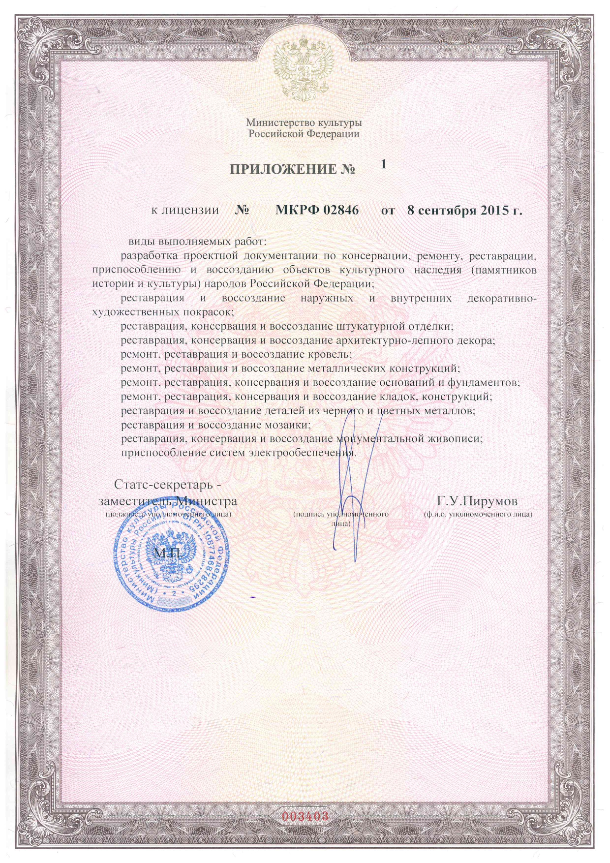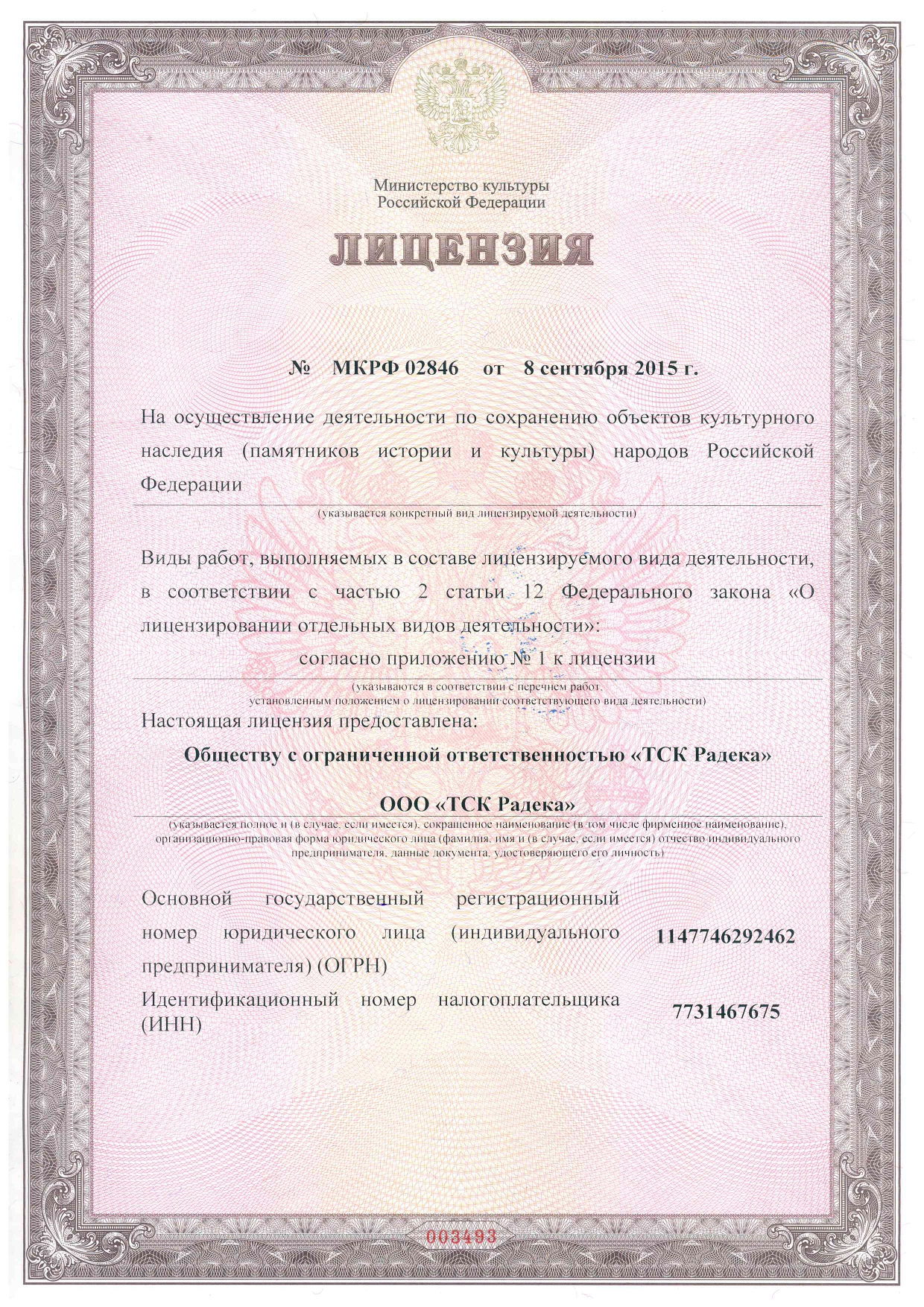 The company "Radeka" is a licensed construction company. License of the Ministry of Culture of the Russian Federation empowers us to provide services in restoration and reconstruction of objects of cultural heritage (monuments of history, architecture and culture) of the peoples of the Russian Federation.